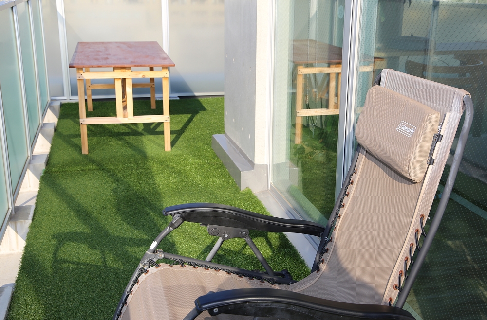 バルコニーが広く、解放感もある物件なので、芝生を敷いてデスクや椅子等も設置しました。ちょっとした息抜きや気分転換にも最適で、メンバーの業務効率向上にも一役買っていると感じています。